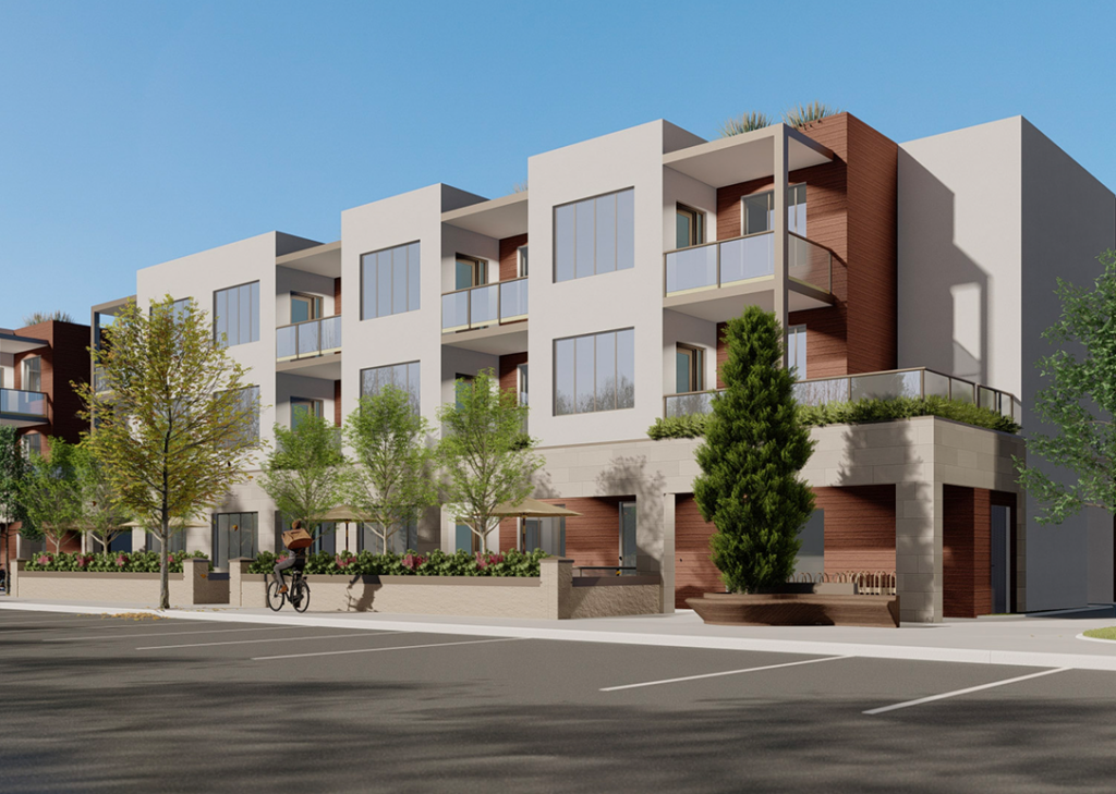 A multi-residential low to mid-level housing development with a building podium containing parking and on-street townhouse use. The concept involves a high density residential with a building massing that incorporates terracing with intermittent exterior terraces that provide building amenity space for the living units along with a larger roof terrace for the main building amenity space. The parking is contained within a multi-level building podium both below and above grade.