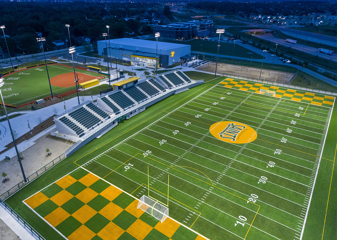 Located within the main campus for St Clair College – Windsor, this project involves the enhancement of sports related activities for outdoor and indoor field sports. The design involves a football field with concession stands, grandstands and change rooms in addition to broadcast booth and viewing platforms. The campus also provides a baseball field for softball with field bleachers and viewing area. Complementing the exterior sports is an indoor tennis facility that contains change rooms, campus store and viewing platforms. The entire campus is linked with a walking trail that connects the main campus to the sports campus.